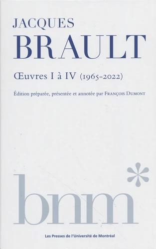 L'oeuvre de Jacques Brault était auparavant éparpillée chez divers éditeurs et plusieurs de ses publications n'étaient plus disponibles. Certains de ses livres sont déjà considérés comme des classiques de la littérature québécoise (Mémoire, Chemin faisant, Moments fragiles, Agonie), mais le regroupement des publications permet de lire autrement ces livres, en les liant à d'autres textes moins connus et en faisant mieux percevoir ce que l'auteur appelait son "cheminement" , qui le conduit d'un engagement social fervent à l'exploration d'un "en dessous" qu'il associe à l'intimisme littéraire. Coffret réunissant les quatre tomes des oeuvres de Jacques Brault.