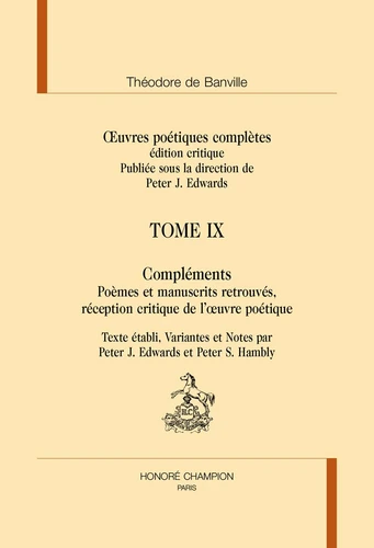 Depuis la publication en 2001 du tome VIII des Ouvres poétiques complètes de Banville, les éditeurs ont recueilli un nombre important de documents retrouvés trop tard pour figurer à leur place logique dans l'édition. Ainsi présentent-ils dans ce volume de "Compléments" plusieurs poèmes inédits ou oubliés qui se rattachent à l'une ou l'autre manière du poète, quelques manuscrits de poèmes revenus récemment à la lumière du jour et, surtout, de nombreux comptes rendus des recueils de poésies de Banville, ainsi que plusieurs études d'ensemble de son oeuvre faites par ses contemporains.