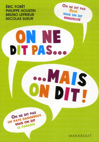 Véritables phénomènes de société, les On ne dit pas... Mais on dit... et les Ne pas confondre... avec... sont en train d'envahir les cours de récréation, les entreprises et Internet ! Cette nouvelle gymnastique cérébrale consiste à jouer avec des mots ou des expressions utilisés quotidiennement de façon à leur donner une tout autre signification. Drôle et ludique, ce savoureux passe-temps joue sur des lapsus, sur des sous-entendus...