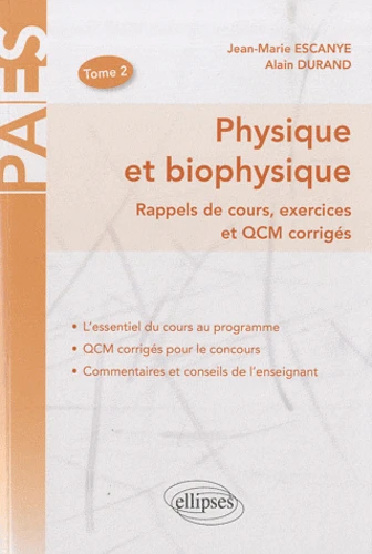 Ce deuxième tome de l'ouvrage Physique et biophysique est destiné aux étudiants de la première année commune des études de santé (PAES). II doit leur permettre d'acquérir une maîtrise concrète des notions de physique et de biophysique qui sont abordées au cours de ce cycle ; les exercices corrigés sont ceux qui sont traités lorsqu'ils participent aux séances de travaux dirigés. Les chapitres correspondent au nouveau programme de la PAES avec la thermodynamique, les liquides et les gaz, puis la mécanique, l'électrostatique et la magnétostatique, et enfin les ondes sonores et l'optique dans le premier ouvrage. Ce second tome comprend les rayons X et la radioactivité, la mécanique des fluides, circulation et les solutions (équilibre acido-basique, diffusion, osmose, effet Donnan). Les résumés de cours sont destinés à rappeler les notions nécessaires avant d'aborder les exercices et les QCM. Ils ont été renforcés par des compléments " pour aller plus loin ", qui permettent de progresser au-delà de la PAES, que ce soit pour les futurs médecins ou pour ceux qui s'orienteront vers d'autres disciplines. Chaque exercice est corrigé, avec, au besoin, un commentaire insistant sur les notions qui ne sont pas toujours explicitées dans le cours, ou qui, d'expérience, prêtent à confusion. Il en est de même pour les QCM.