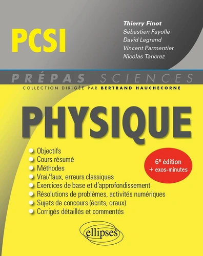 La 6e édition de cet ouvrage a pour objectifs de permettre aux étudiants en PCSI de réviser leur cours de Physique et de l'assimiler par la mise en application des notions. Dans chaque chapitre, correspondant à peu près à une semaine de cours, le lecteur trouvera notamment : - Le résumé de cours et les méthodes, pour assurer ses connaissances ; - Le vrai/faux pour tester sa compréhension du cours et éviter de tomber dans les erreurs classiques ; - Les exercices corrigés, souvent tirés de sujets d'annales, pour s'entraîner aux concours.