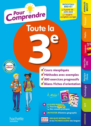 Tout ce qu'il faut savoir et savoir faire dans toutes les matières ! Une double page par notion, avec : le cours, clair et complet, pour retenir l'essentieldes méthodes et de nombreux exemples, pour savoir utiliser le cours dans les exercicesplus de 800 quiz et exercices progressifs, pour bien s'entraîner Et aussi : des infos sur l'orientation après la 3e avec des fiches-métiers200 quiz interactifs pour se tester gratuitement Les fichiers audio des langues gratuits EN PLUS ! Tout pour préparer et réussir le Brevet : Des sujets entièrement corrigés + le nouveau Brevet expliqué + des conseils