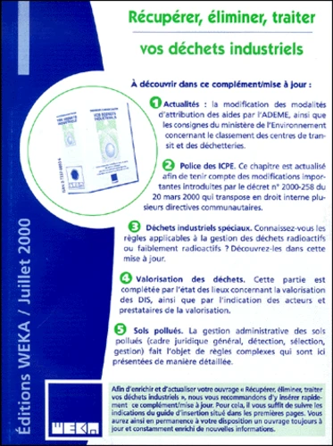 A découvrir dans ce " complément/mise à jour ". Actualités : la modification des modalités d'attribution des aides par l'ADEME, ainsi que les consignes du ministère de l'Environnement concernant le classement des centres de transit et des déchetteries. Police des ICPE. Ce chapitre est actualisé afin de tenir compte des modifications importantes introduites par le décret n° 2000-258 du 20 mars 2000 qui transpose en droit interne plusieurs directives communautaires. Déchets industriels spéciaux. Connaissez-vous les règles applicables à la gestion des déchets radioactifs ou faiblement radioactifs ? Découvrez-les dans cette mise à jour. Valorisation des déchets. Cette partie est complétée par l'état des lieux concernant la valorisation des DIS, ainsi que par l'indication des acteurs et prestataires de la valorisation. Sols pollués. La gestion administrative des sols pollués (cadre juridique général, détection, sélection, gestion) fait l'objet de règles complexes qui sont ici présentées de manière détaillée. Afin d'enrichir et d'actualiser votre ouvrage " Récupérer, éliminer, traiter vos déchets industriels ", nous vous recommandons d'y insérer rapidement ce " complément/mise à jour ". Pour cela, il vous suffit de suivre les indications du guide d'insertion situé dans les premières pages. Vous aurez ainsi en permanence à votre disposition un ouvrage toujours à jour et constamment enrichi de nouvelles informations.