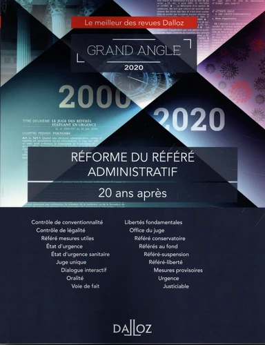 Cet ouvrage s'inscrit dans la collection Dalloz Grand Angle qui propose le meilleur des 32 revues Dalloz sur un sujet précis. Qu'elles soient opérationnelles ou doctrinales, de droit public ou privé, ces revues offrent une analyse croisée aussi riche que pertinente de l'actualité. Cet ouvrage est dédié à l'anniversaire des 20 ans de la loi sur la réforme du référé administratif. La loi du 30 juin 2000 a profondément modifié le traitement de l'urgence en contentieux administratif.
