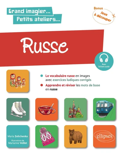 Grand imagier... Petits ateliers... Accessible à tous, cet imagier invite à : - découvrir le vocabulaire de base utile pour communiquer au quotidien ; - apprendre à prononcer correctement chaque mot, grâce au modèle ; - mémoriser les mots à son rythme et de façon ludique. MODE D'EMPLOI. PREMIERE ETAPE... APPRENDRE. Découvrir, prononcer, mémoriser 240 mots grâce aux 20 planches d'images thématiques et aux 40 enregistrements audio abordant les domaines suivants : - Le matériel scolaire ; - Les aliments et les boissons ; - La famille ; - Les objets courants ; - Le corps humain ; - Les vêtements et les chaussures ; - Les fruits ; - Les mots de politesse ; - Les légumes ; - Les transports ; - Les sports et les jeux ; - Les animaux domestiques ; - La ville ; - Les meubles et la maison ; - Les animaux sauvages ; - La nature et la météo ; - Les personnes et les métiers ; - Les nombres ; - La vaisselle ; - Les couleurs.