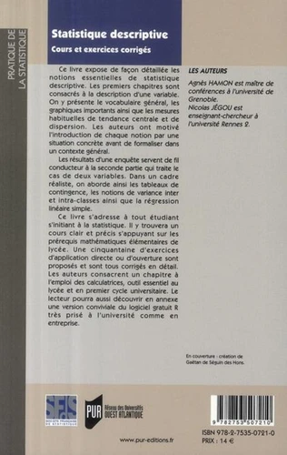 Ce livre expose de façon détaillée les notions essentielles de statistique descriptive. Les premiers chapitres sont consacrés à la description d'une variable. On y présente le vocabulaire général, les graphiques importants ainsi que les mesures habituelles de tendance centrale et de dispersion. Les auteurs ont motivé l'introduction de chaque notion par une situation concrète avant de formaliser dans un contexte général.
