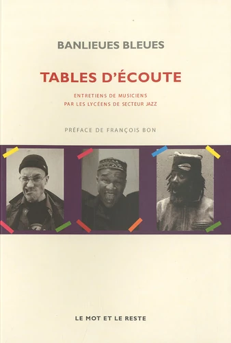 "Vous avez vraiment de très bonnes questions, bien meilleures que celles de la plupart des journalistes ", réplique le guitariste Marc Ribot aux (im)pertinentes questions de ses jeunes interviewers. Ces tables d'écoute rassemblent les meilleurs entretiens parus dans le journal Secteur Jazz: de 2001 à 2009, des lycéens de Drancy, Tremblay-en-France, La Courneuve, Noisy-le-Grand ou Pantin, ont vécu leur année scolaire aux rythmes des musiciens invités dans le cadre du festival Banlieues Bleues, Jazz en Seine-Saint-Denis. Chaque mois de mars, dans les coulisses des salles de concert, quelques adolescents lancés à la recherche de sons et de sens conversaient passionnément avec des musiciens s'ouvrant à eux de la manière la plus affranchie possible. Ce rituel s'est répété pendant près d'une décennie, préparé en classe pendant de longs mois, avec des professeurs, un ethnologue,Alexandre Pierrepont, et un photographe, Eric Garault Le pari était de saisir l'occasion offerte par la présence et la disponibilité de ces musiciens, pour ces jeunes, et d'aller avec eux au cœur des choses. Vers la vision au cœur de ces musiques, transmise de génération en génération - d'Andrew Hill, Bernard Lubat ou Danyel Waro à Jason Moran, Médéric Collignon ou Otomo Yoshihide - jusqu'à ces adolescents: tour à tour fabuleuse, politique ou magique, toujours en quête d'affirmation individuelle et de création collective, de diversité et d'harmonie, d'un monde d'une lumineuse hospitalité. Banlieues Bleues organise le festival de jazz du même nom, événement réputé comme l'un des temps forts de la vie musicale en France. En 27 ans, ses concerts disséminés sur une quinzaine de villes de Seine-Saint-Denis ont offert au public leur lot d'émotions. Ses a actions musicales ", vaste dispositif d'ateliers et de projets autour des artistes du festival, permettent chaque année à des milliers de jeunes et de moins jeunes de se plonger dans des aventures musicales et humaines uniques. Depuis 2006, les activités de Banlieues Bleues sont également relayées toute l'année dans sa salle de concerts, La Dynamo.