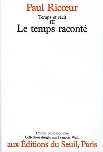 Temps et récit III remet en scène les trois protagonistes de Temps et récit I et II : l'historiographie, la théorie littéraire du récit de fiction et la phénoménologie du temps. Mais le débat se déplace cette fois du travail de configuration temporelle interne au récit, au pouvoir qu'a celui-ci de refigurer, autrement dit d'éclairer et de transformer, l'expérience quotidienne du temps. L'hypothèse mise à l'épreuve par la première section de ce livre est que la phénoménologie, en s'élargissant et s'approfondissant, de saint Augustin à Heidegger, aboutit, en regard de la cosmologie, à une incontournable Aporétique du temps.
