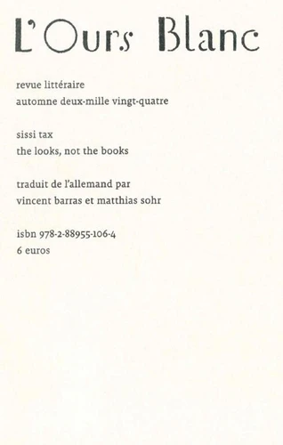 The looks, not the books [les allures, pas les livres], Conférence avec suppléments publié à Leipzig en 2016, est issu d'une conférence tenue par l'autrice. Le livre comprend le texte prononcé à cette occasion : une réflexion profondément ironique, critique et politique sur le rapport du regard, des femmes et des livres dans la tradition cinématographique hollywoodienne (mais aussi européenne) du 20e siècle.