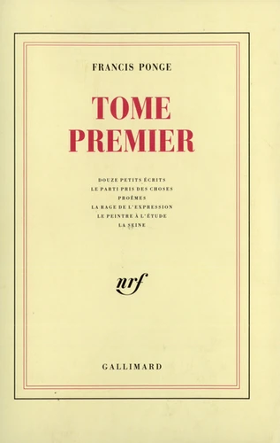 "Ce volume constitue la première édition collective des ouvrages de Francis Ponge parus en librairie avant Le Grand Recueil (1961) et Pour un Malherbe (1965). Il comprend dans l'ordre : Douze Petits Ecrits, paru dans la colleclion "Une Ouvre un Portrait" en I926, depuis longtemps épuisé et jamais réédité ; Le Parti pris des choses, paru dans la collection "Métamorphoses" en 1942, réédité en 1945 et 1949, toutes ces rééditions étant également épuisées ; Proêmes, paru en 1948, épuisé, réédité ici pour la première fois ; La Rage de l'Expression, paru en 1952 en Suisse, édité en France ici pour la première fois ; Le Peintre à l'Etude, paru en 1948, réédité ici pour la première fois ; La Seine, paru en 1950 en Suisse, épuisé, non réédité, édité ici pour la première fois en France.