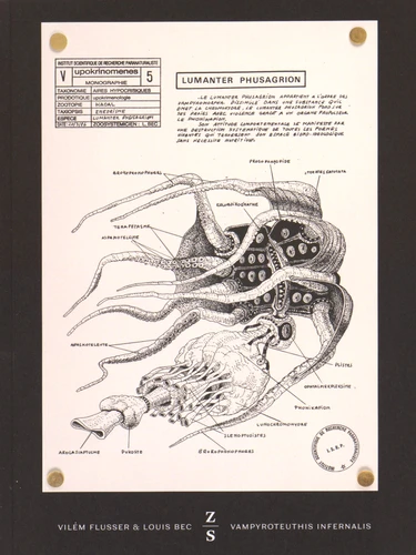 ....insondables des océans vivent des êtres si éloignés de nous qu'ils semblent avoir été créés afin de renvoyer notre image inversée..Ces fabuleuses créatures peuplant les abysses de notre bonne vieille Terre nous obligent à repenser l'humain depuis leur point de vue ; nous avons alors affaire à une phénoménologie naturaliste au décentrement extrême, faisant exploser toutes nos catégories de pensées usuelles, en premier lieu desquelles le dualisme matérialiste anthropocentriste.
