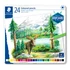Crayon de couleur de forme classique hexagonale à tête trempée. Vernis à la couleur de la mine pour une reconnaissance et une différenciation facile des couleurs. Mine douce pour une large palette de techniques de dessin à sec dans des couleurs lumineuses. Pigments de couleur intenses faciles à mélanger. Bois certifié issu de forêts gérées durablement. 24 couleurs intenses.