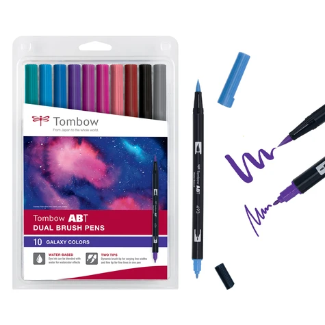 Plongez dans les profondeurs de la galaxie - avec les couleurs Tombow Galaxy ! Vous trouverez dans ce set toutes les nuances nécessaires pour créer des galaxies en violet-magenta, mais aussi du gris et du noir pour des représentations plus lunaires. Les couleurs galaxie constituent de bons arrières-plans pour des silhouettes d’animaux, des horizons urbains ou des personnages. Le set comprend les couleurs suivantes : 1 x ABT-407, 493, 555, 636, 665, 755, 803, 873, N15, N55. Les ABT Dual Brush Pen ont deux pointes pour une polyvalence maximale. La pointe pinceau élastique vous permet de varier l’épaisseur de trait par la pression opérée, ce qui la rend aussi particulièrement adaptée pour un lettering dynamique. La pointe fine permet d’ajouter de petits détails ou de tracer des contours qui apportent ce petit quelque chose qui magnifie votre œuvre. Grâce à l’encre à base d’eau, vous pouvez mélanger à tout moment la couleur ou la diluer pour un effet aquarelle. Conseil: A vous les étoiles! Découvrez dans un tutoriel de l’artiste Kathrin-Nina Vinko comment ajouter des étoiles dans votre galaxie.