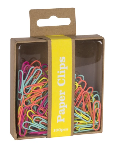 Trombones - Fluor Collection. Contenu : 100 trombones dans des couleurs fluorescentes. Couleurs : fuchsia, jaune, orange et turquoise. Boîte : en carton kraft, facile à accrocher grâce à son design pegboardable. Les trombones colorés sont originaux et brisent la monotonie des fournitures de bureau classiques !