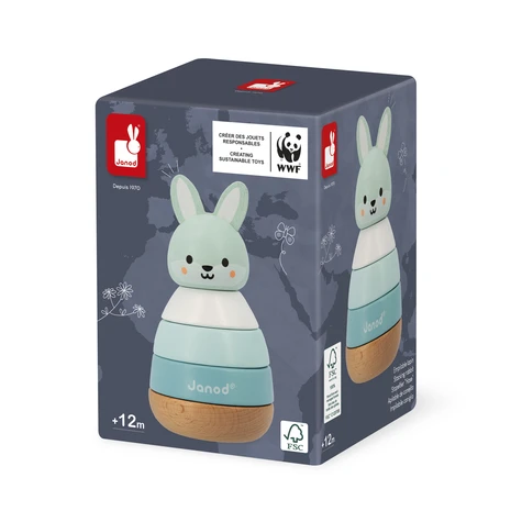 Joli lapin en bois massif à empiler. 4 pièces de tailles et de couleurs différentes sont à empiler dans le bon ordre pour reconstituer le lapin. Idéal pour développer la motricité fine et aider l'enfant à se familiariser avec les tailles et les couleurs. Jouet en bois FSC. Jouet d'éveil pour les enfants de 12 mois.