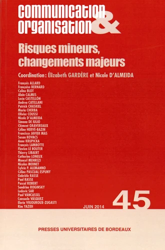 L'objectif de ce numéro est d'analyser comment s'opère, sous l'effet des dispositifs d'information et de communication, le couplage entre une culture généralisée du risque et une réorganisation du social, des pratiques et des modes de vie tant individuels que collectifs. A côté des nombreuses publications consacrées aux risques dits majeurs, nous nous inscrivons ici dans un horizon qui n'est pas celui de la catastrophe mais celui du vécu et du quotidien.