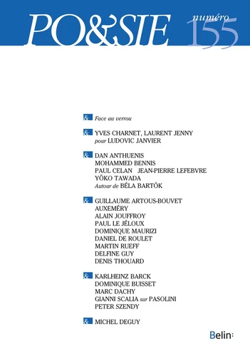 Michel Deguy, Claude Mouchard, Face au verrou Ludovic Janvier (1934-2016), Avec des mots volés à Ludovic Janvier par Yves Charnet ; Apparitions / disparition par Laurent Jenny Dann Anthuenis Merzblider, traduit du flamand par Leo De Schepper et Arnaud Villani Mohammed Bennis, L'invitation du port, traduit de l'arabe par Abdelwahab Meddeb Paul Celan, Spasmes, traduit de l'allemand et commenté par Jean-Pierre Lefebvre Yôko Tawada, L'an 2045, traduit du japonais par Cécile Sakai Autour de Béla Bartók, Poésie hongroise, présentée par Guillaume Métayer Guillaume Artous-Bouvet, Monologues de la forme Auxeméry, Humanité du poème Alain Jouffroy (1928-2015), Lettre à Fady Stephan Paul Le Jéloux (1955-2015), Traversée de L'Ishalo.