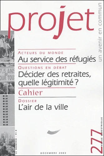 Au service des réfugiés. L'itinéraire d'un Australien responsable du service jésuite des réfugiés. Ces derniers, dont le nombre augmente avec les conflits interethniques, se heurtent à des pays souvent prêts à les renvoyer ailleurs. Décider des retraites, quelle légitimité ? Après les rapports et livres blancs, le processus de décision du printemps 2003 sur les retraites laisse insatisfait. L'articulation entre concertations politiques et dialogue social reste à définir. L'air de la ville. L'air de la ville, celui d'une mobilisation de tous, des citoyens, des associations, des acteurs économiques et politiques ? Sûrement. Pourtant, ici, la vie urbaine conduit à l'isolement, à la formation de ghettos. Ailleurs, un vivre ensemble se construit, qui conjugue mobilité et enracinement.