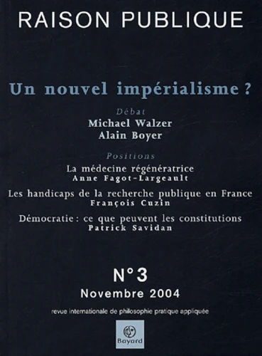 L'intervention des Etats-Unis et de leurs alliés en Irak a contribué à modifier substantiellement le cours de la réflexion dans le domaine des relations internationales et de la théorie de la démocratie. Michael Walzer, de l'université de Princeton, et Alain Boyer, de l'université de la Sorbonne (Paris IV), reviennent sur certaines des questions qui ont été à cette occasion soulevées : Assistons-nous à l'émergence d'un nouvel impérialisme ? Comment penser la stabilité de " l'ordre " mondial et la place que doit y occuper le droit ? Nous suivrons ensuite les réflexions de Anne Fagot-Largeault, professeur au Collège de France, consacrées à la médecine régénératrice et à ses implications éthiques. Sa ligne directrice vise les critères qui permettraient de déterminer les limites éthiques de la recherche en la matière. C'est également à la recherche que s'intéresse François Cuzin, ancien directeur d'unité à l'INSERM. Mais c'est alors pour poser, à partir de son expérience significative, le problème de sa possibilité pratique et de son efficacité. Patrick Savidan enfin, de l'université de la Sorbonne (Paris IV), pose le problème du rapport entre constitution et démocratie et s'interroge sur les voies qui pourraient permettre, en France, d'avancer en ce domaine.